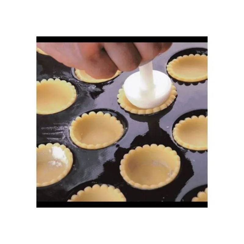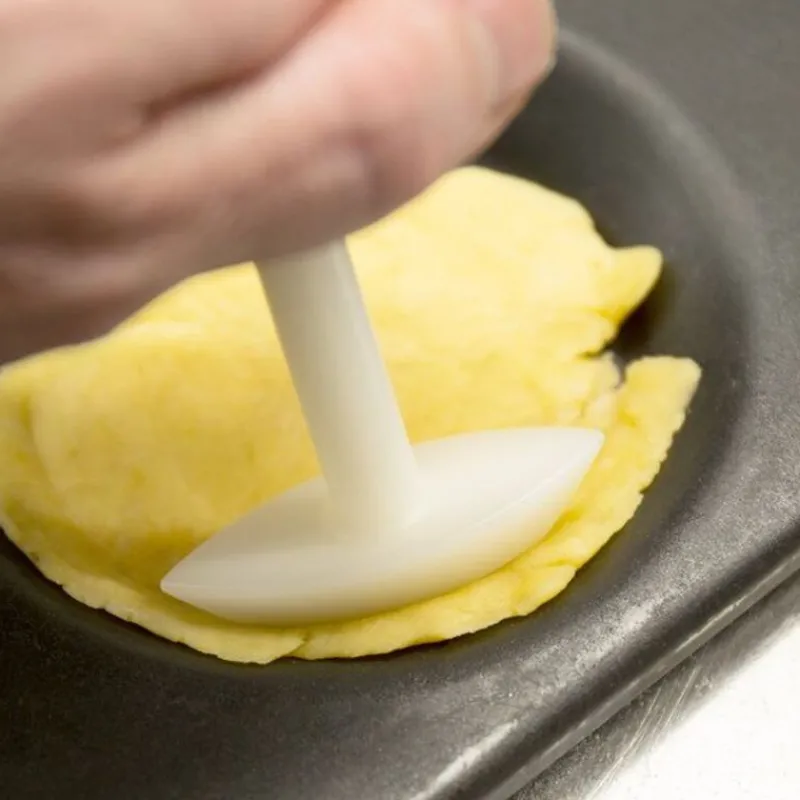 Outil de fonçage à deux têtes en polypropylène, pour moule en silicone, utilisé pour foncer les tartelettes unies de 4,2 et 4,8 cm de diamètre, ainsi que les barquettes de longueur de 7,5 cm.