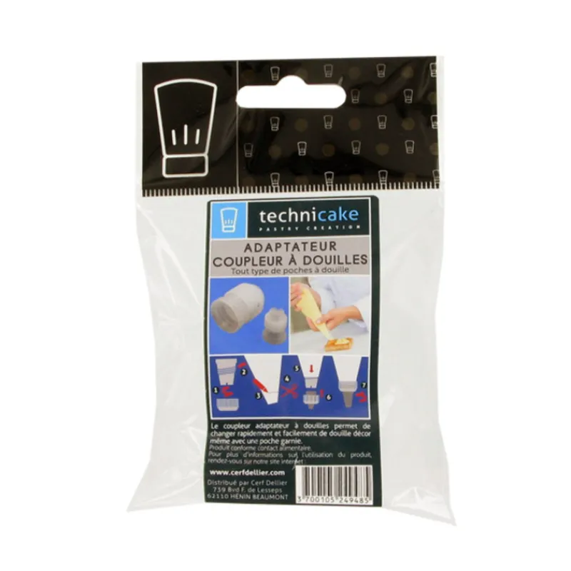 L’adaptateur de douilles est un embout en plastique qui permet de changer de douilles, même avec une poche garnie, sans la vider. Ainsi, il permet de réaliser différents décors sur un gâteau.