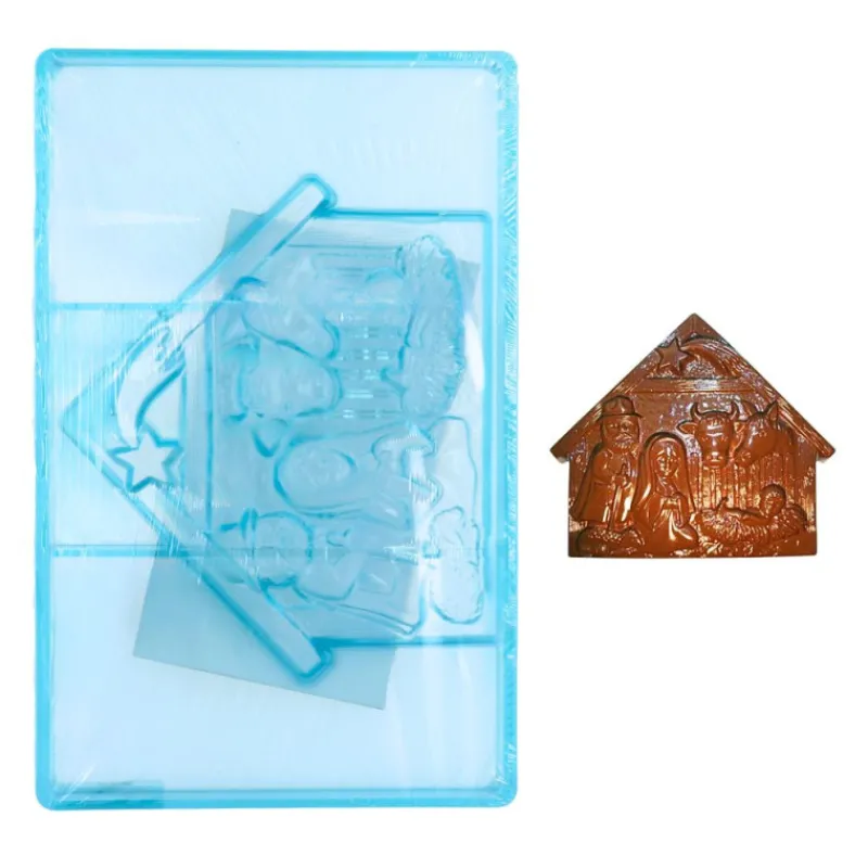 Moule à chocolat permettant le moulage d’une crèche de Noël en chocolat.