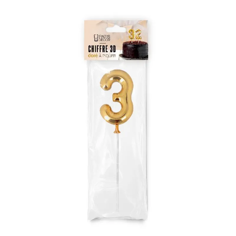 Chiffre n°3 en 3D sur pique, à positionner sur vos gâteaux d’anniversaire : idéal pour obtenir une décoration chic et originale.