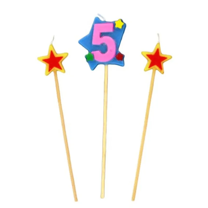Donnez de la hauteur et du volume à votre gâteau d’anniversaire, avec cet ensemble de 3 Bougies d’anniversaire chiffre n° 5 et étoiles, comprenant une bougie chiffre sur pique et 2 bougies étoiles sur pique à planter sur le gâteau.