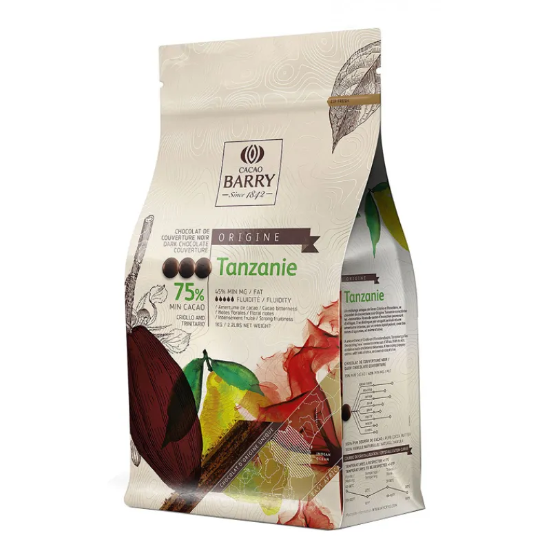 Le chocolat de couverture Noir Origine Tanzanie 1 Kg 75 % Cacao Barry en pistoles allie harmonieusement l’acidité à l’amertume intense du cacao et il s’agrémente de belles notes florales.
