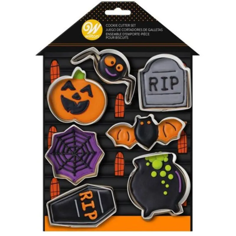 Cet assortiment d’emporte-pièces d’Halloween Wilton se compose d’une araignée, d’une citrouille, d’une pierre tombale, d’une toile, d’une chauve-souris, d’un cercueil et d’une chaudière.