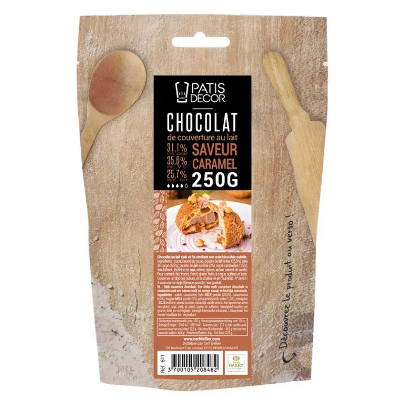 Le chocolat de couverture au lait saveur caramel Patisdécor en pistoles possède un agréable goût caramel et se mariera, par exemple, très bien avec une pincée de sel dans vos recettes.