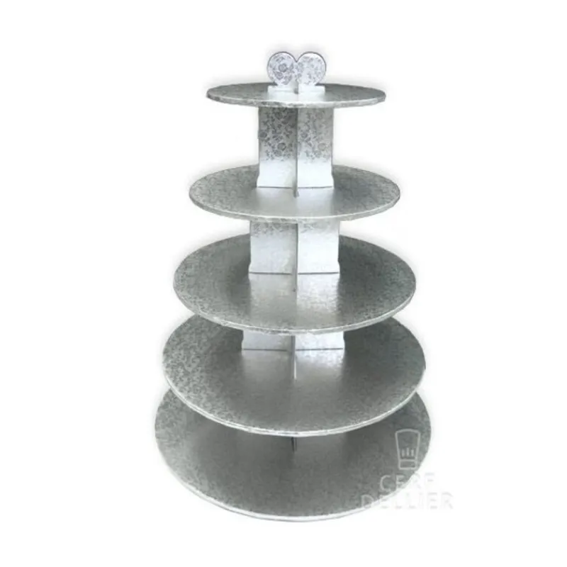 Présentoir Cupcakes 5 étages ronds argentés, parfait pour la présentation des petits gâteaux, tels que petits fours et cupcakes.