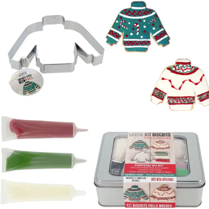 C’est possible, grâce à ce kit pour sablés pulls de Noël moches. Il contient tout le matériel et les décors nécessaires à leur réalisation :