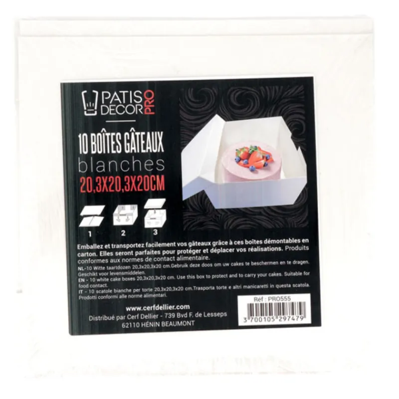 Cette ensemble de 10 boîtes pâtissières est apte au contact alimentaire. Agrémentez-la d’un joli ruban pour un résultat sublimé. Placez votre gâteau ou wedding cake sur un cake drum ou un carton or, avant de le placer dans la boîte, pour une meilleure stabilité de vos réalisations.