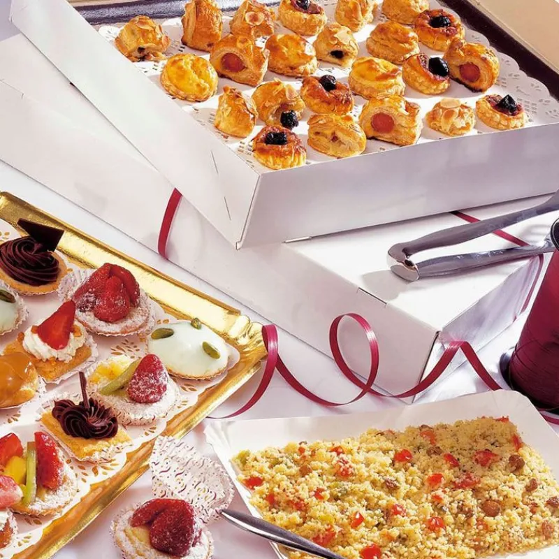 Ces boîtes traiteur blanches en carton de forme rectangulaire sont idéales pour emballer et transporter vos plateaux de mignardises, toasts et canapés.