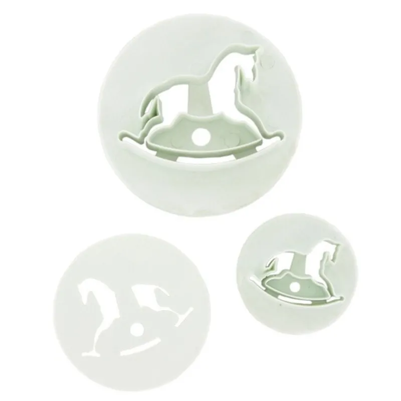 Jeu de 3 découpoirs « cheval à bascule » spécial fondant, pâte à sucre et pâte d’amandes. Ils seront également parfaits pour réaliser des biscuits et petits gâteaux.