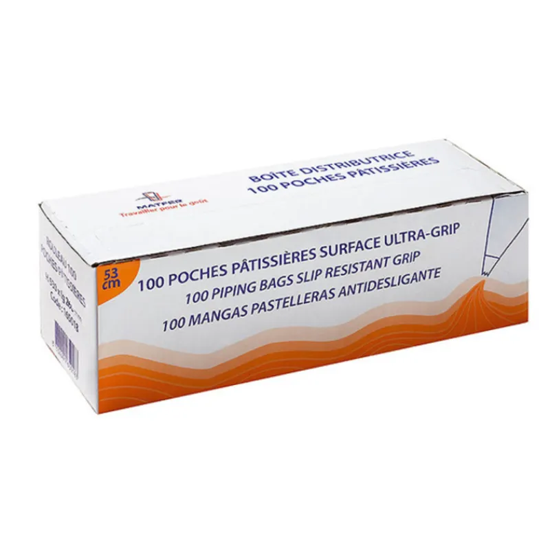 Rouleau de 100 poches pâtissière jetables standard vendues en boîte distributrice.
