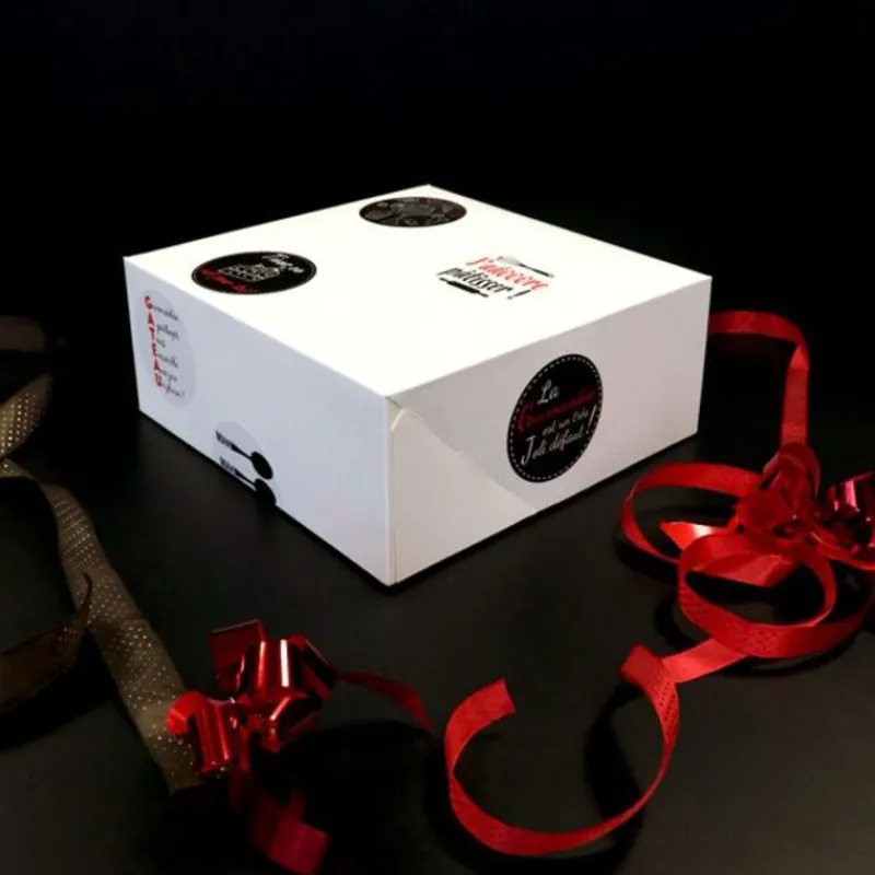 La boîte pâtissière personnalisable est vendue à l’unité, avec sa planche de 6 stickers assortis, dans les tons de blanc, de noir et de rouge. Les stickers sont de formes de rondes et d’un diamètre de 7 cm :