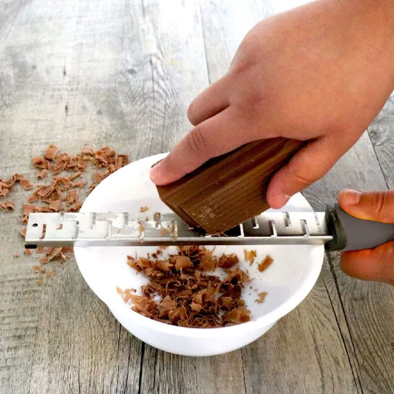 Elle possède une lame en acier inoxydable, très tranchante, et un manche ergonomique pour des coupes nettes et précises. Celle-ci permet de râper des copeaux extrêmement fins de chocolat, de truffes ou encore de fromages à pâte dure.