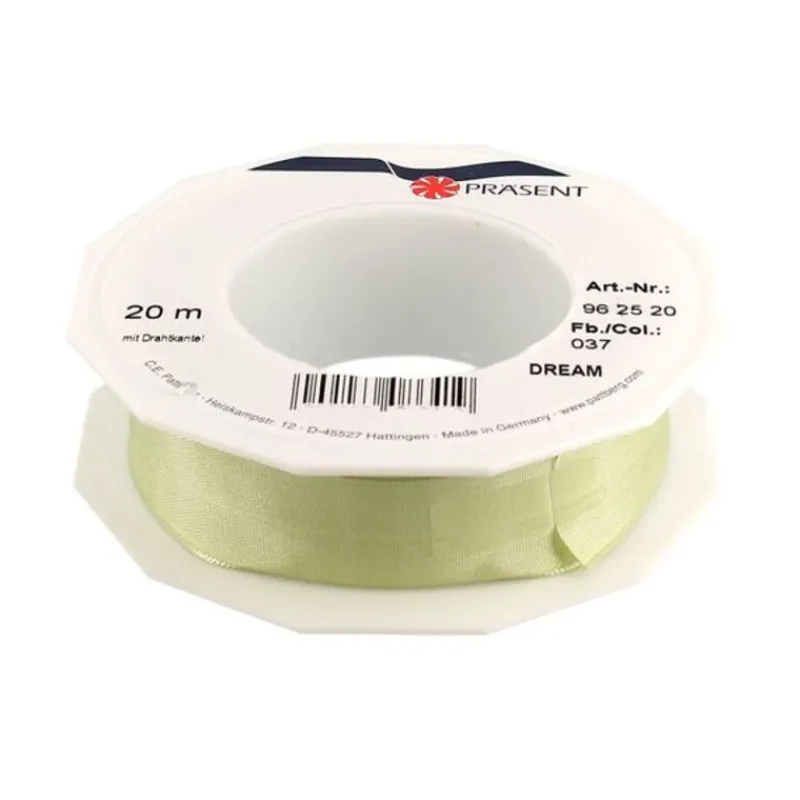 Bobine de 20 m de Ruban vert anis, largeur 25 mm, parfait pour l’emballage et la présentation des boîtes gâteaux, des boîtes à oeufs et à poules en chocolat, des ballotins.