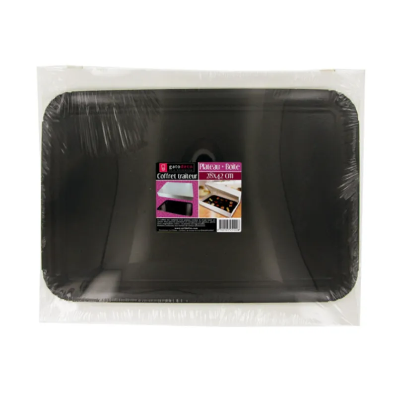 Le coffret traiteur se compose d’un plateau traiteur noir en carton ingraissable et d’une boîte traiteur blanche refermable en carton. Il permet de présenter et transporter en toute sécurité, vos petits gâteaux, amuses-bouche, mignardises, toasts sucrés et salés pour vos réceptions.