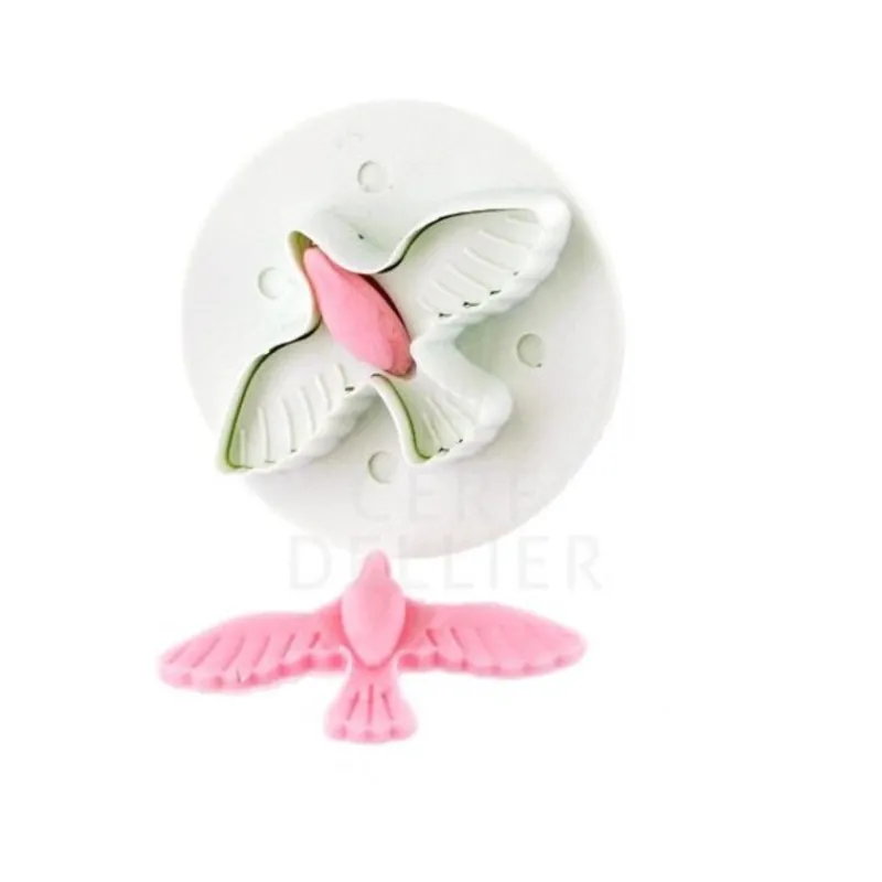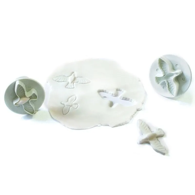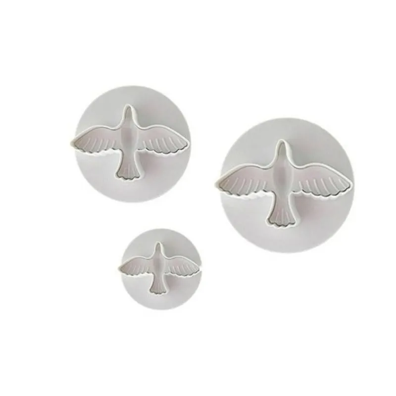 Ensemble de 3 découpoirs éjecteurs colombes, pour réaliser des colombes en pâte a sucre ou pâte d’amande. Idéal pour la décoration de vos gâteaux et cupcakes !