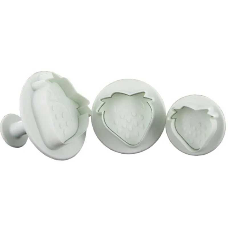 Ensemble de 3 découpoirs éjecteurs en forme de fraises : idéal pour confectionner des jolies fraises en pâte à sucre ou pâte d’amande.