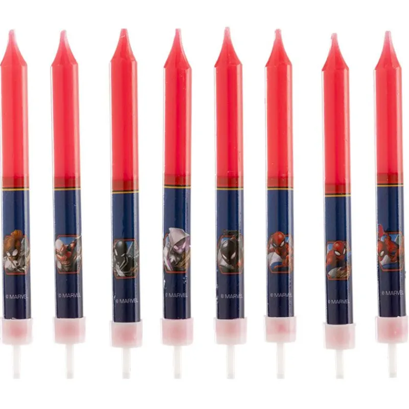 8 bougies d’anniversaire, représentant des personnages de Spiderman. Idéal pour le gâteau d’anniversaire de votre petit héro, qui fera à coup sûr son bonheur !