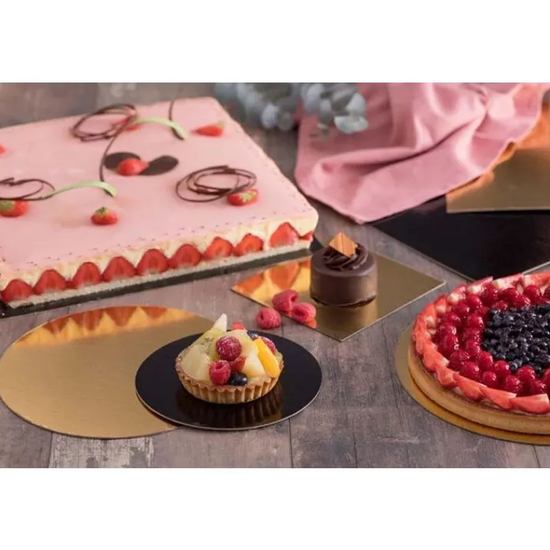 Plaque rectangulaire en carton en carton double face (Or / Noir) de qualité alimentaire, pour la présentation des entremets.