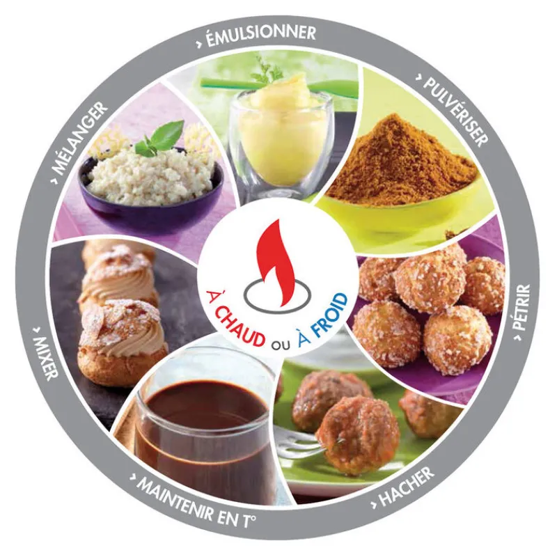 5 fonctions vitesse: vitesse variable de 100 à 3500 tours/min, haute vitesse turbo 4500 tours/min, pulse à vitesse variable, mélange des produits délicats en rotation inverse du couteau de 100 à 500 tours/min