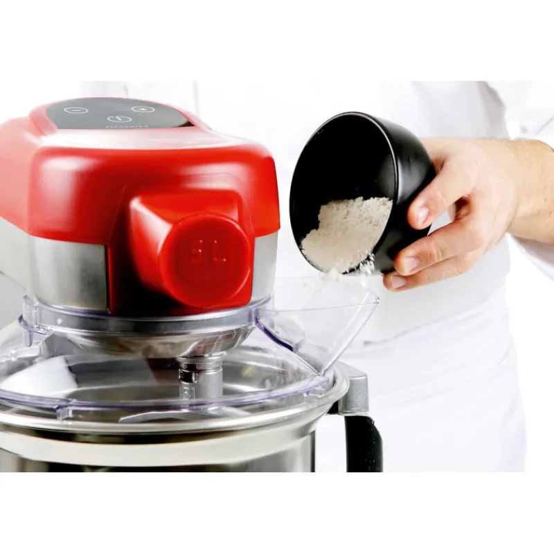 Cuve en inox avec poignée ergonomique contenance 5,5 l avec fond bombé qui permet de travailler de très petites quantités et favorise un pétrissage efficace