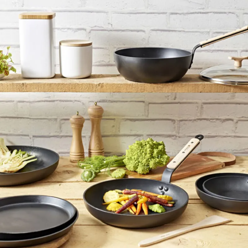 - Queue feuillard noire habillée de deux plaquettes de bois de hêtre Vosgien finies à la cire d’abeille : protègent de la chaleur et simplifient la prise en main.