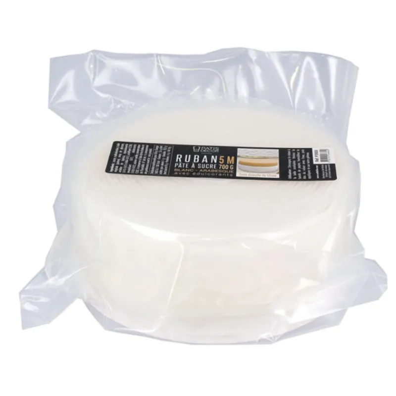 Le ruban est livré en rouleau dans un emballage hermétique qui lui évite de se dessécher. Il est collé sur une bande plastique, pour plus de facilité d’application : vous n’avez plus qu’à le dérouler pour l’appliquer autour de votre gâteau.