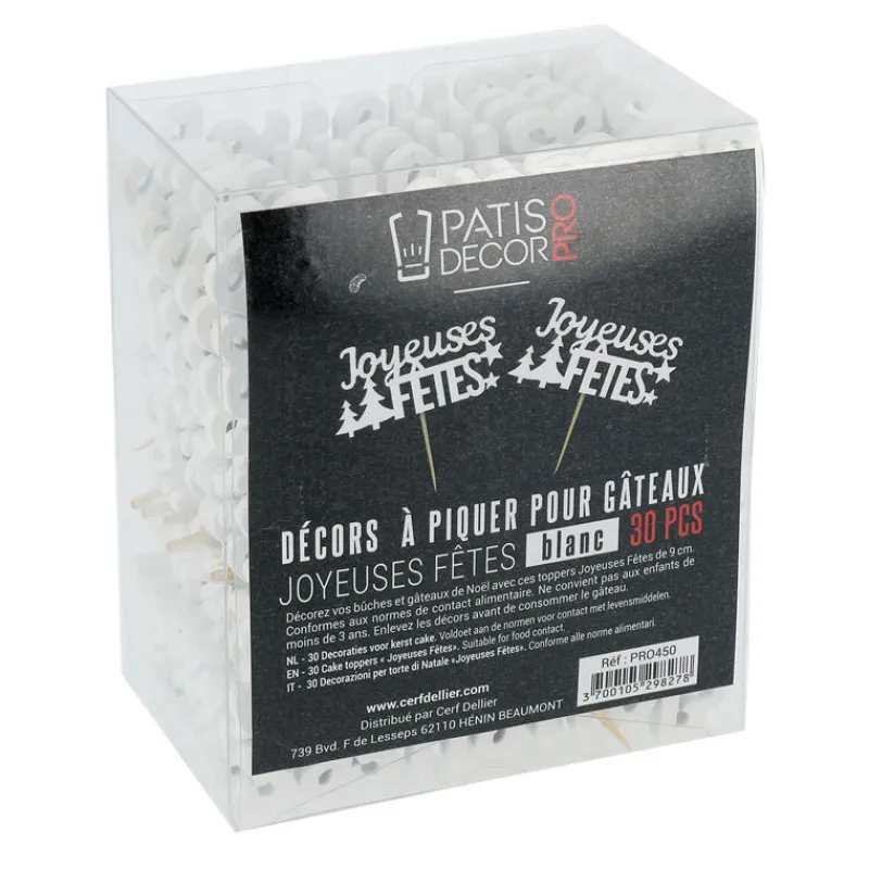Ces décors sur pique « Joyeuses Fêtes » blancs sont la touche finale parfaite pour votre décoration de fête de fin d’année. Fabriqués en bois et peints avec des couleurs vives, ces décors ajoutent une touche festive à tous vos desserts et compositions florales.