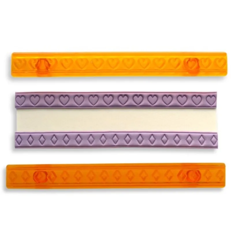 Avec cet ensemble de 2 découpoirs rubans coeurs et diamants, vous pourrez réaliser très facilement d’étroits rubans de pâte a sucre ou de pâte d’amande imprimés de cœurs et de diamants en relief pour décorer vos gâteaux, vos cupcakes, etc…