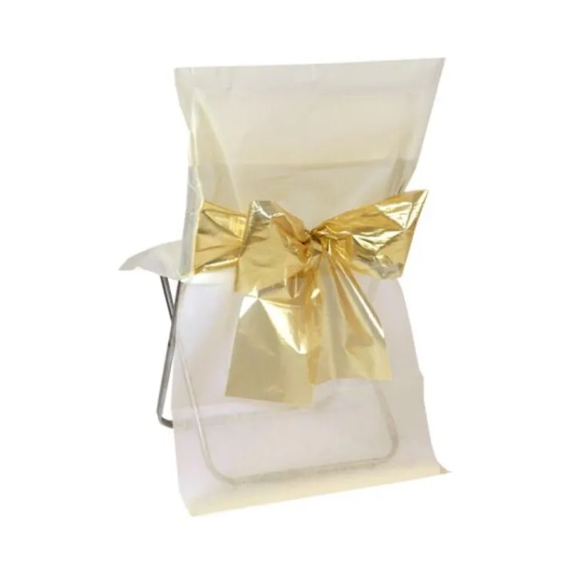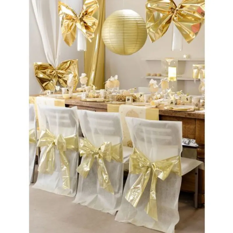 Ces housses de chaise ivoire noeud métallisé peuvent être associées avec des sets de table, des assiettes et des gobelets ou encore des banderoles dans les mêmes coloris.