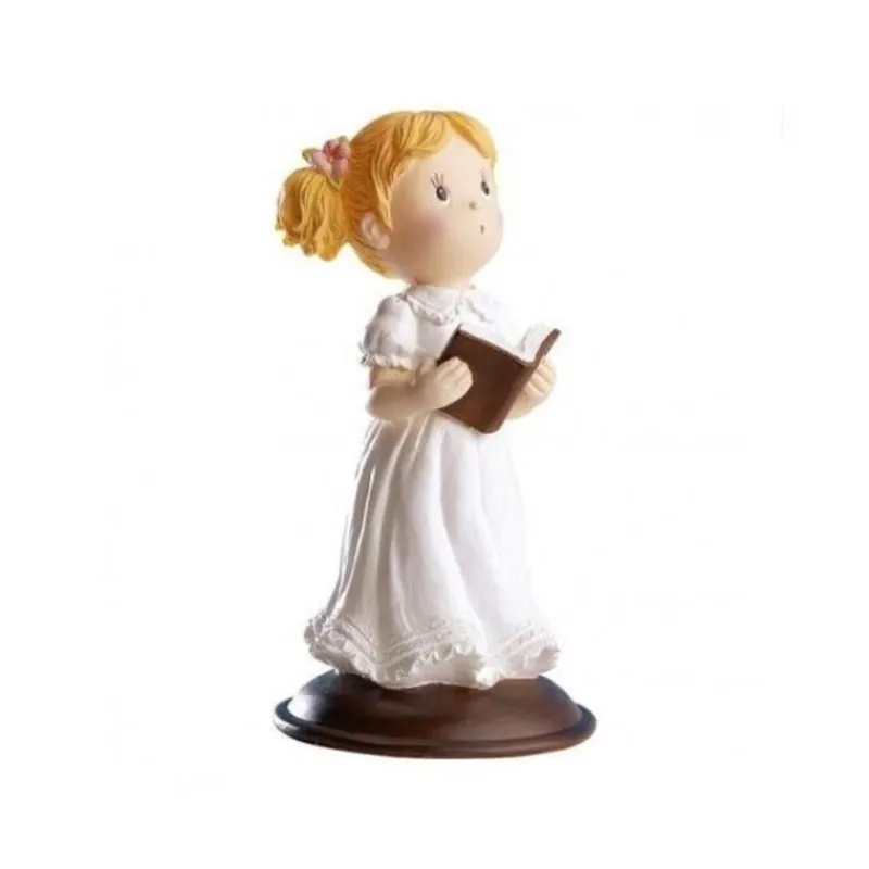 Cette jolie communiante souriante, tenant une Bible, peut être utilisée pour la présentation des dragées ou pour la décoration de table.