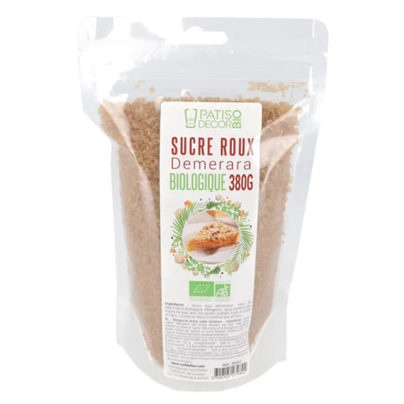 Sucre roux demerara biologique, conditionné en sachet sous vide de 380 g.