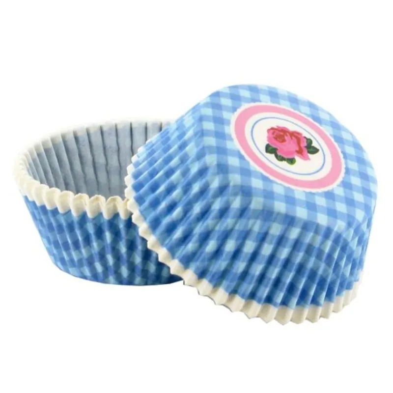 Ces caissettes à cupcakes vichy bleues décor rose sont un moyen rapide, facile et amusant de réaliser des cupcakes raffinés !