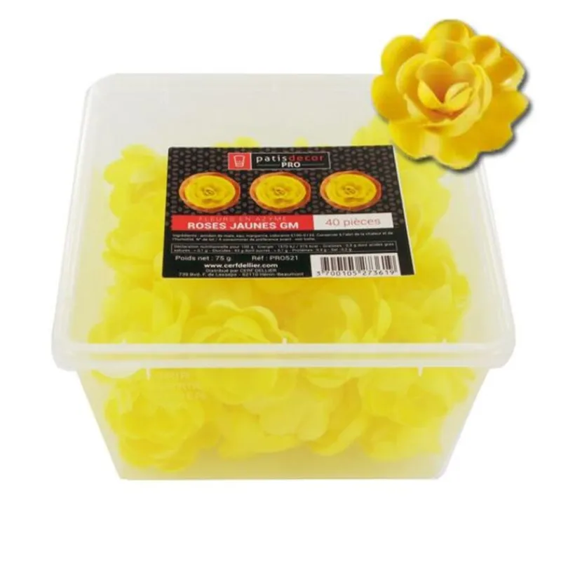 Ces grandes roses en azyme jaunes sont conditionnées en boîtes de 40 pièces. C’est idéal pour répondre aux besoins des professionnels de la pâtisserie, qui doivent décorer de nombreuses créations.