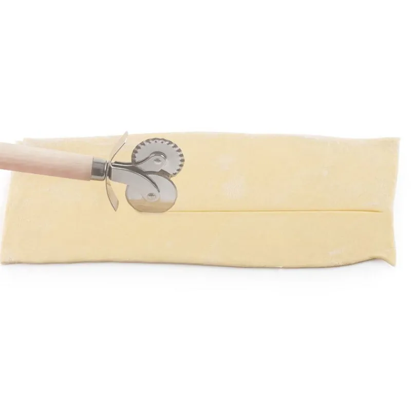 Cette roulette à pâte double est idéale pour couper rapidement et facilement des bandes de pâtes, lisses ou cannelées.